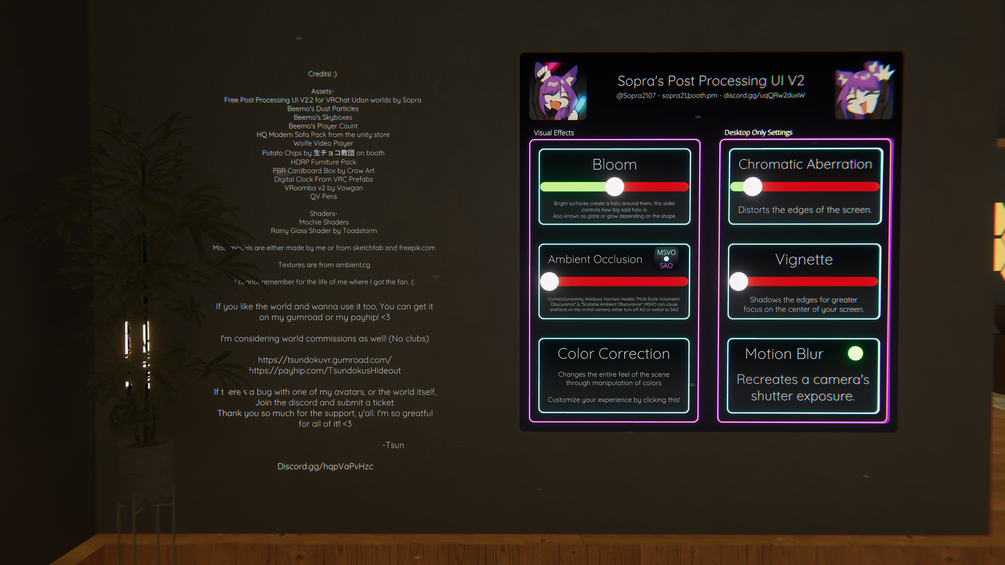 This is a small avatar display world I made for my future avatars, though I love the cozy feeling to it and decided to share it. This package includes shaders needed for the world, and the world itself in an organized unity project. This world includes 2 HQ an LQ Mirrors as well as Wolfe's video player, and a few UDON goodies. Though it is beginner friendly, Please have basic unity knowledge before purchasing.